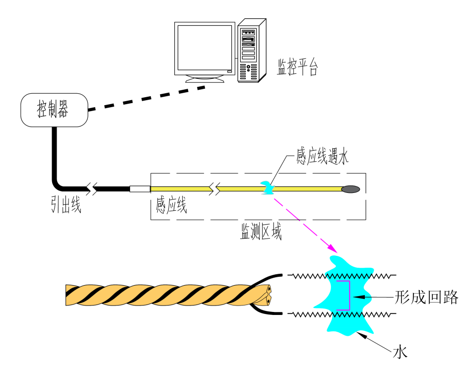 當有液體與感應線接觸時,兩根感應線內芯線遇液體導通,形成回路,泄漏控制器檢測到泄漏情況,發(fā)出報警信號。