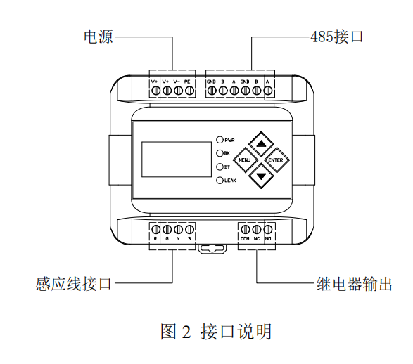 控制器可通過面板按鈕直接設置通訊地址、波特率等。電源、通訊、感應線與繼電器輸出接口如圖所示: