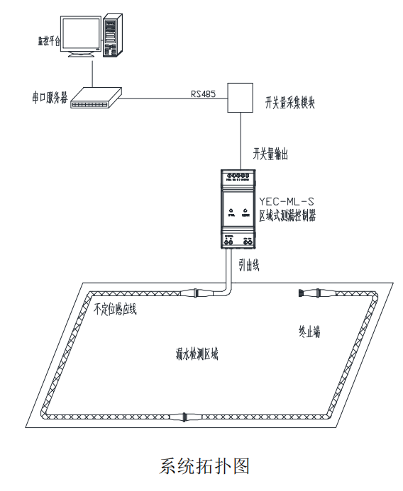控制器 YEC-ML-S 與感應(yīng)線連接,通過(guò)開關(guān)量信號(hào)輸出將泄漏情況數(shù)據(jù)匯集至開關(guān)量模塊,轉(zhuǎn)換成RS485 信號(hào)傳輸至上位機(jī)??刂破骼^電器輸出信號(hào)可用來(lái)控制外圍設(shè)備如聲光報(bào)警器、電話撥號(hào)器、
