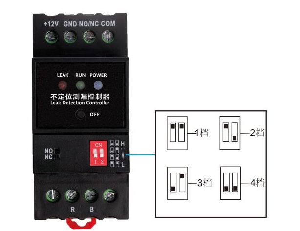 - 控制器設置有一個靈敏度調節(jié)撥碼開關,可適應不同環(huán)境下的漏液檢測,1至4檔檢測靈敏度依次增強,出廠默認為第4檔。各檔位所對應的控制器感應靈敏度如下表: